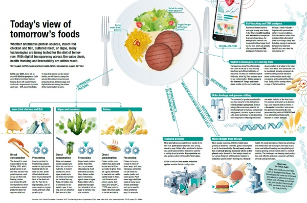 Alternative protein sources, insect-fed chicken and fish, cultured meat and algae – many technologies are being tested for the diet of tomorrow, according to Bühler.